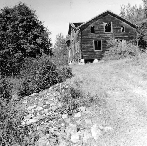 Bildtext: Byggnad med fyra personer i förgrunden. Byggnaden kallades för Kilen, och var Viktor Sundins hem, även Emma Sundin bodde där. Fastigheten har i dag adress Militärvägen 4.
