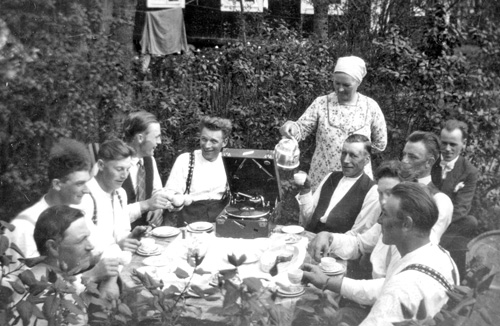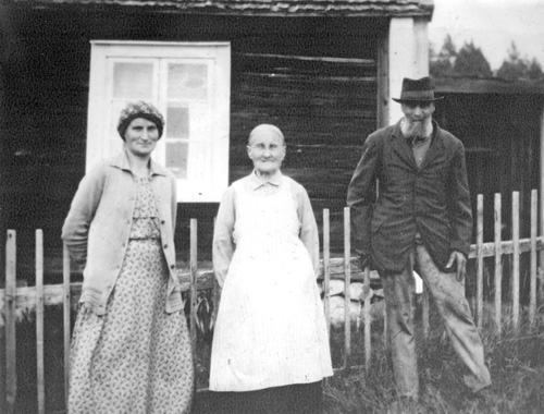 Bildtext: Pensionärer från Enånger samlade vid ingången till Godtemplarhuset (IOGT-lokalen). Tre är märkta med X och de skall vara August Burman, Axel Berg och Ostlund (Östlund?) som brukar vara vid Långvind. Vem som är vem framgår ej. Inkomna bildsynpunkter kompletterar med följande namn: Femma från vänster på förstugukvisten är Anders Olof Thorén och damen i vit hatt till höger nedanför är hans fru Anna Thorén. I främre rad fr v: August Landin (Bölan), August Burman (Holmen) och trol. Axel Berg (Borka). Stående under vänster kryss Lars Östlund (Bölan), damerna i samma rad: Margret Händel, Anna Rolinder, Alma Landin (fr v o samtliga Bölan). I grå mustach och stående bakom Östlund: Otto Henriksson (Bölan). Med hatt på sned invid dörren: Herman Hermansson (Bölan), vid den andra dörrposten Anders Söderholm (Bölan). Kompletterande bildsynpunkt: Mannen längst fram sittandes, tredje mannen från vänster är Axel Berg, min farmors far. Det finns ett annat foto på honom, ett porträtt på tidigare sidor här. Han var ordförande i fiskareföreningen i Borka. Axel Berg levde mellan åren 1876-1957. (Noterat av Ulla Walén). Ytterligare bildinfo: Det finns även ett fjärde kryss. Över mannen längst till höger som är Hans Olov Östlund från Bölan. I mörk kavaj i mitten: Thorén.