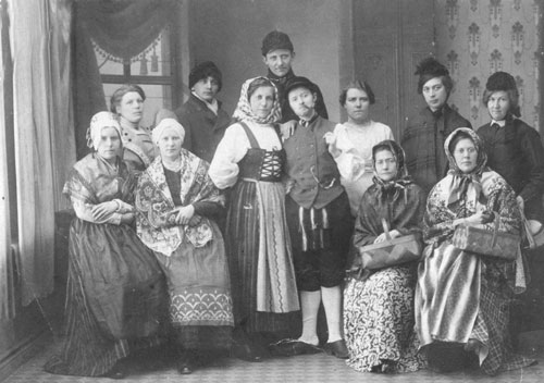 Bildtext: "En glad afton hos tant Marta i Vedmora". 1:a rad: Gustav Paulsson f 1921 fosterpojk hos fam Frisk 1G115 o 126, August Frisk 1881-1937 1G79 o 115, Kristina Svedlund Frisk 1877-1957 14G16 o 1G115, Ida Frisk g Rehnström 1902-1990 1G115 o 124, Hedvig Svedlund g Enström f 1911 14G18 o 2H23. Bakre rad: Eva Gustavsson g Nilsson f 1901 21T1, Oskar Svedlund f 1907 14G18, Axel Rehnström 1901-1984 1G124, Olga Svedlund g Nordlund f 1912 14G18 o 10F16, Agda Smedberg lärarinna fr Boden, Edvard "Vinlund" Andersson f 1909 6T10 dräng hos Kjellins - flyttade till Luleå 1927, Alfred Svedlund f 1905 14G18 o 20