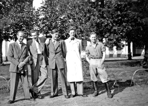 Bildtext: En grupp människor, sannolikt samlade i "Lombo" Finnika, följande namn har noterats: John Svedin, Hans-Olov Olsson, "Landbo-Olle" Enström samt dennes syster Edit, Dagmar Berglund, Hanna Matsson