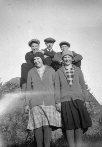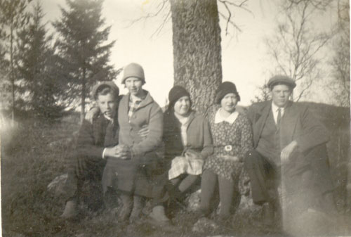 Bildtext: Andra raden nerifrån, förste med armarna i kors: John Johansson, ovanför till höger Axel Westberg. Inkommen bildsynpunkt kompletterar: Troligen Anna Bäckman (Lövgren),övre raden längst ut till vänster bredvid henne Eivor Rehnström (Sättlin), övre raden fjärde från vänster: Gunhild Jonsson (DeBeau) Längst ner Wilhelm och Ida Jonsson, i mitten sitter Anna Jonsson (Östlin). Wilhelm och Ida var föräldrar till Gunhild och Anna. Längst bak vid fönstret, 2:a fh Olga Melin g Henriksson