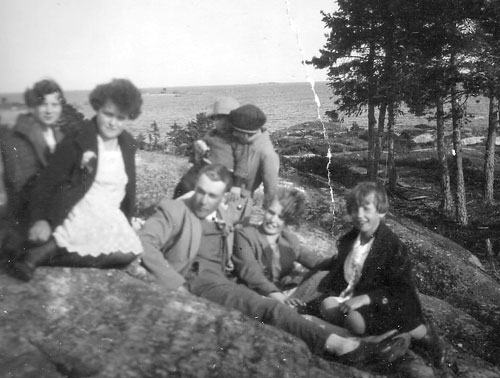 Bildtext: Klara och Per Olsson i Nybo med barnen Ivar, Per-Olov, Nils-Erik, Anna, Ada, Emma, Adolf, Johanna, Helmer Se bildnummer: ep-priv-1. Inkommen bildsynpunkt kompletterar: Minstingen Oskar Helmer är född 20/10 1918. Äldst i barnaskaran var Anna kristina född 1897. Ada/1900, Per Olof och Emma/1902 som tvillingar, Nils Erik/1904, Johan Ivar/1906, Johanna/1909 samt Adolf född 1913. Pappa Per 1863-1952 samt mamma Klara f.1879. Grängsjö 3 Nybo Enånger sn. Allt enligt kyrboken.