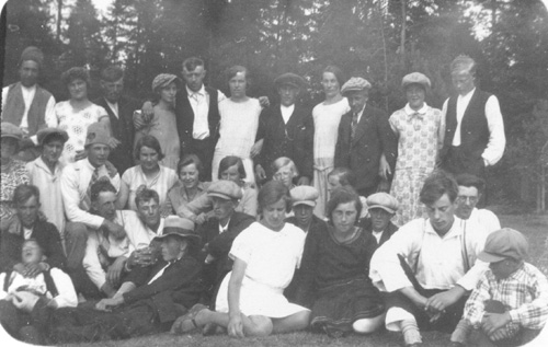 Bildtext: Platsen är: Genmyran, Änga. Text på kort: Lisen o Henriks guldbröllop (Sättlin). Inkommen bildsynpunkt kompletterar: Henrik Sättlin med fru Lisen, Änga. Stående från vänster: Verner, Elin, Anny, Eve, Anna, Vanda, Anna, Per, Valter, Astrid. Överst står Anders-Olov och Yngve. Henrik och "Lisen" Sättlins GULDBRÖLLOP i Änga Enånger. Uppvaktade av längst bak fr.v. Anders Olof Johansson(f.1895), Yngve Johansson(f.1925). Tredje raden fr.v. Anna Sättlin(f.1904, g.Johansson), Anna Kjellin(f.1897, g.Sättlin), Valter Sättlin(f.1895), Gösta Sättlin (f.1923). Andra raden fr.v. Verner Sättlin(f.1903), Elin Eriksson(f.1902 , g.Sättlin), Anny Sättlin(f.1928), Eve Jonsson(f.1927,g.Enström), Vanda Sättlin (f.1901, g.Jonsson), Per Jonsson (f.1901), Astrid Sättlin(f.1925, g. Westling). Främst; "Lisen" (f.Holmin 1873) och Henrik (f.1872) Sättlin. Se även bild nr: labu-294 och boeri-25