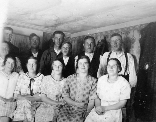 Bildtext: arbetarlag vid Boda by. Bodabor på trilla vid Vassved strax nedom Stallgården i Boda Enånger. fr.v. Einar Borin, Beda Larsson, Wilhelm Sättlin, Signe Borin, Stina Enberg, Gösta Andersson, Viktor Andersson, Hilda Andersson, Hildur Persson, Gunda Johansson, Olga Fridlund, Okänd, Okänd, Skogvaktare Persson