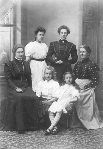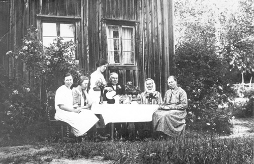Bildtext: Möjligen frikyrkomusikanter. Osäkra namnangivelser fv: Jakob Svensson, ”Olken”, Eva Malmberg-Nordell, Margareta Vasberg-Eriksson, Lena Brant-Olsson, ?, Gustav Vasberg, Vasberg. Platsen är möjligen Elim-kapellet. Inkommen bildsynpunkt: Lite spekulationer kring bilden: mannen till vänster ser ut att kunna vara: Jakob Johan Svensson (2S10) 1855-1938 från Njöte s2 Njutånger. Bonde i Sätra s1 Enånger. Kanske mannen till vänster är hans broder: Pehr Olof Svensson?? 1851-1900 även han bonde i Sätra och gift med Karin Brolin från Sätra 2. Texten till bilden säger ju tvärt om att den vänstra är Jakob så antagligen är det så då.