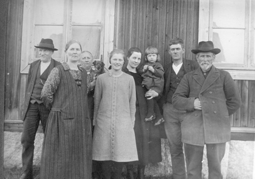 Bildtext: Fv: Erik Molin (1857-1951), Kristina Svedlund 8F26 o 14G18 (f1876), Marta Olsson (1864-1939) med hunden Gissa, Olga Svedlund 14G18 o 10F16 (f1912), Helen Jonsson 12E9 o 5T50 (f1901), Greta g Mattsson 5T50 o 61 (f1923), Johan Jonsson 5T35 o 50 (f1898), Per Jonsson "Perjonsa" 5T20 o 35 (f1869). Se även bild: bs-priv-47