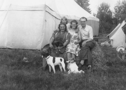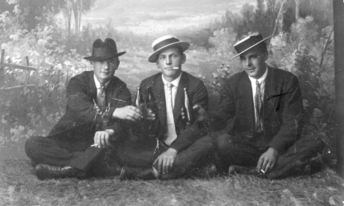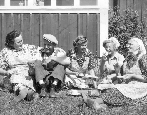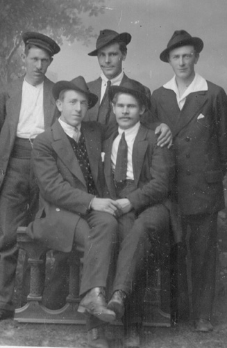 Bildtext: Stående fr. vänster: Erik Bohlin, Per Sjödin, Karl Baggström, Olle Eriksson, Gustav Heineman, Holger "Bölja" Berglöv, Gösta Baggström.