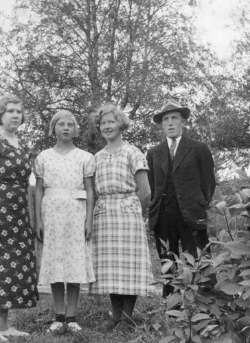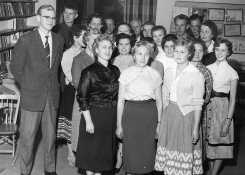 Bildtext: Revygänget bakom vårkabarén ”Frusta lätt”, på bygdegården år 1956. Överst fv: Stefan Persson, Märtha Persson, Vivi Larsson, Bertil Westling, Margit Colling, Karin Nordell, Rune Åkerlund. Främre rad: Bernt Åkerlund, Rune Sättlin, Bernt Eriksson, Sven Jonsson, K G Andersson