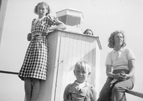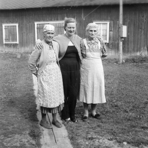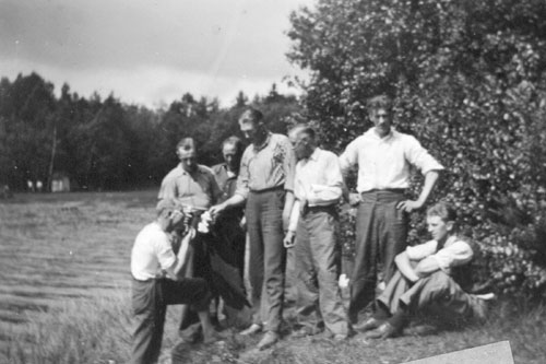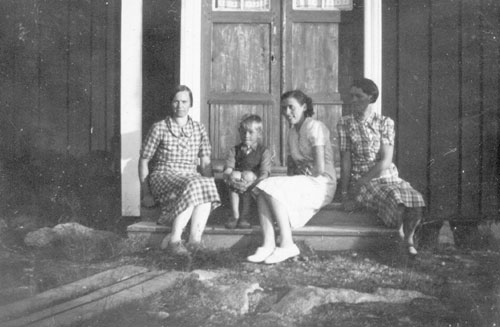 Bildtext: Från Holmen. Följande namn är noterade: Lars-Olov Larsson, Johan Olov Svedin, Annie Gustavsson (Burman), August Burman, Nils-Erik Burman, Anna Burman (Larsson) , Hj. Ljungström(?), Gunhild Hedberg, Karin Westling (Hållén). Inkommen bildsynpunkt kompletterar: Lars-Olov Larsson 1858-1935, Johan Olov Svedin 1856-1921, Annie Gustavsson f.1904 (Burman), August Burman f.1875, Nils-Erik Burman 1863-1938, Anna Burman f.1882 (f.Larsson), Hj. Ljungström(?) Gunhild Hedberg f.1913, Karin Westling f.1912(Hållén)