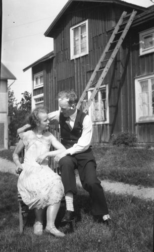 Bildtext: Inkommen bildsynpunkt meddelar: Jag tror att det här kortet är taget i Hallbergs i Bro. Kvinnan är en av systrarna Hallberg, eller möjligen mor Selma. Mannen är lik Lasse Hallberg, så det är kanske hans far Elis.