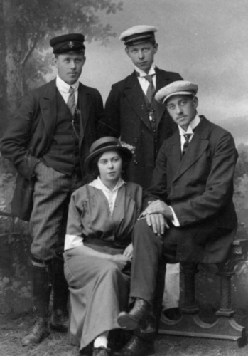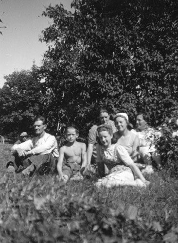 Bildtext: På bron i Wästnång, Finnika. Fv: Kaj Berglund, Lennart Sjödin, Sigrid Westling (i dörröppningen), Kerstin Westling (Larsson), Göta Sjödin och Sven Westlings döttrar Gunilla och Monica