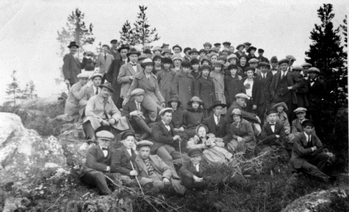 Bildtext: Slåtter i Holmen, i bakgrunden syns "Ersk-Hans" gård. Fv: Hans Erik Eriksson, dottern Ester Eriksson, okänd, Karl Edlund (frikyrkopredikant), okänd