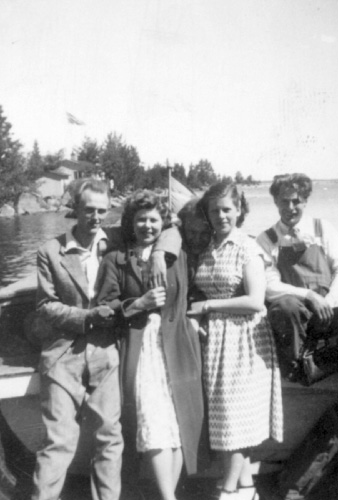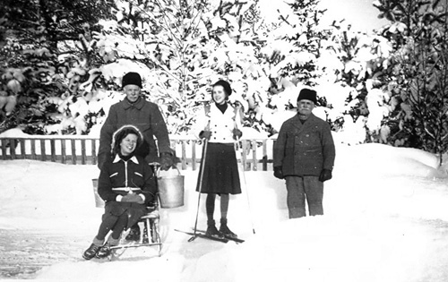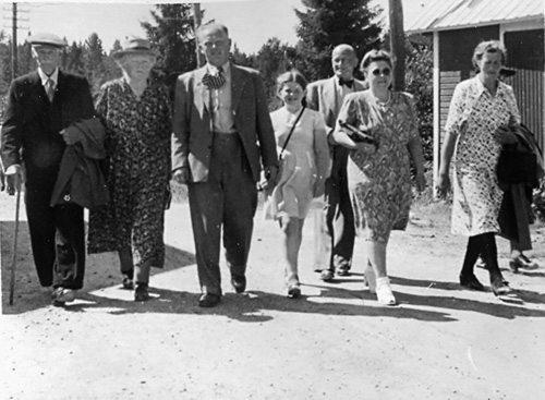 Bildtext: Eric Lundblad med följe. Fr v Eric och Astrid Lundblad, Richard Lundblad, Gunilla Anerud dotter till Elsa Lundblad, okänd man , sonhustru Greta Lundblad, okänd dam