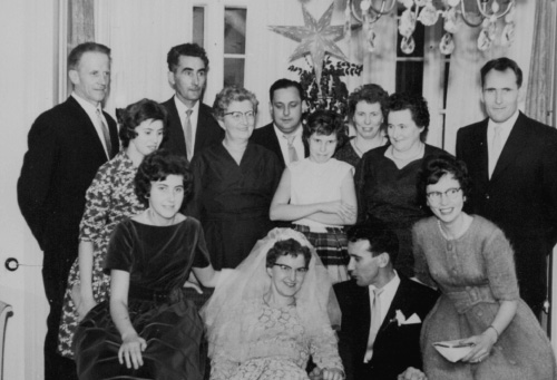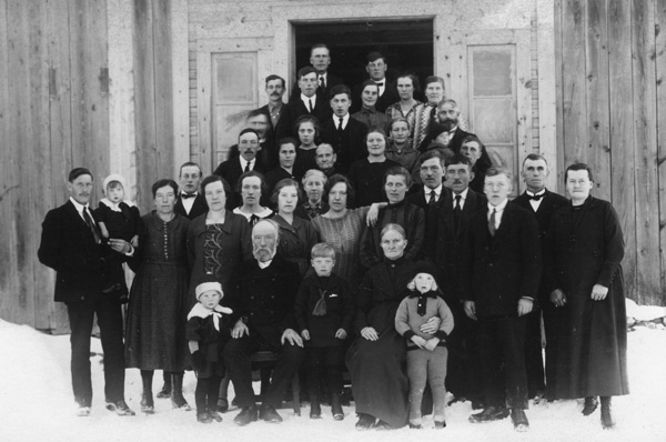 Bildtext: Släktträff hos Emma och Anders-Olov Westling. Följande namn finns noterade, nedifrån och uppåt utan säker inbördes ordning. Emma Broman g Westling, Anders Olof Westling, Olof Svensk?, Per Svensk?, Anders Svensk?, Emanuel Svensk, Elsa Svensk, Signe Westlin g Svensk, Siri Westling, Karin Westling g Sjödin, Anna Westling g Holm, Maria Falk g Westling, Johan Westling, Karl Westling, Karl Broman (18E14 släktbok), Ida Engvall g Broman (4H11 släktbok), okänd, Ragnhild Westling g Matsson, Axel Matsson, Olof Westling, Frida Svedin g Westling, Inga Westling, okänd, Karin Westling g Bodin, Vilhelm Westling, Anna Svensk g Enbom, Anders-Olof Enbom (1H14 släktbok). Johanna och Johan haglund, Axel Westling, Gunnar Westling, Olof Sjödin (samt tre okända)