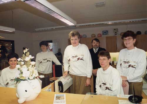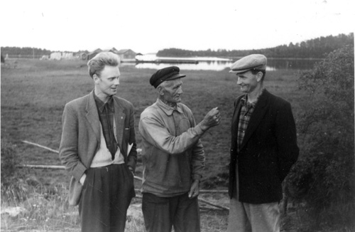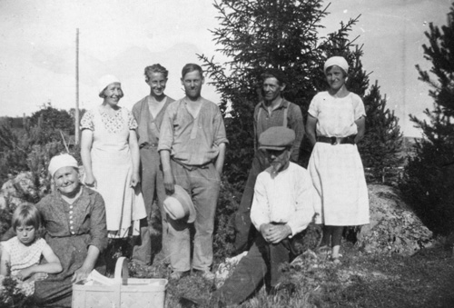 Bildtext: Från Våtnäs. Fv: Ida Svedin, Edit Jonsson, Joel Enbom, Agda Jonsson, Agust Burman, Karin Enbom, Per-Johan Jonsson. Barnen: Inger Svedin, Ruth Jonsson, Arne Jonsson