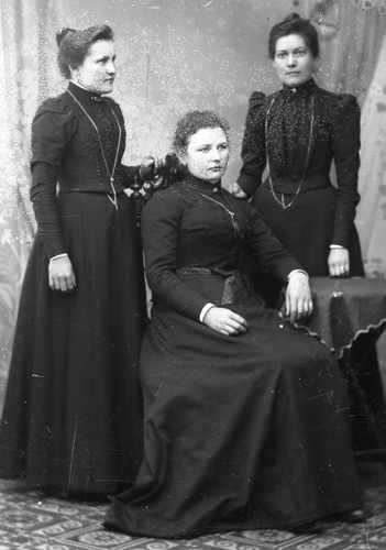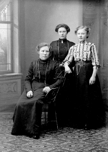 Bildtext: Stående f.v: Lars Erik Åker, Sandarne. Julia Åker f Svensk. Adolf Svensk, Söderhamn. Adolfs hustru. Fru Svensk, Lindefallet. Viktor Svensk. Anna Enbom f Svensk. Viktor Svensk, Haga. A O Enbom. Sittande: Manne Svensk, Tosätter. Per Svensk, Tosätter. Fru Svensk d.ä. Signe Svensk f Westling. Inkommen bildsynpunkt kompletterar: Adolfs hustru bör vara Maria Sundström f1882 Ö Tosätter 8. Viktors hustru bör vara Hanna Settlin f 1894 V Bölan 6. Fru Svensk d.ä. Dvs Per Jonsson Svensk´s (1849-1934) hustru bör vara Christina Andersdotter 1849-1935 från V Finnika s9. Ytterligare bildsynpunkt noterar: Kortet som står på bordet framför blommorna är Pers och Christinas son, Anders Olof Svensk född 1874-01-09, som emigrerade till Amerika 1893-03-17. Bilden på honom verkar ha stått på hederplats alltid när de hade kalas.