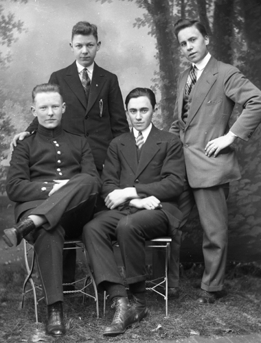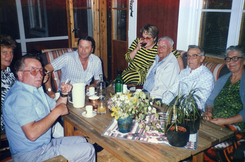 Bildtext: På verandan hos Jan o Yvonne Lindblom "Tömta" Hålsänge. Fv: Klara Borin, Åke Bodell, Erik Borin, Yvonne Lindblom, kusinerna Gustav Baggström, Johan Bergman, Karin Lindblom