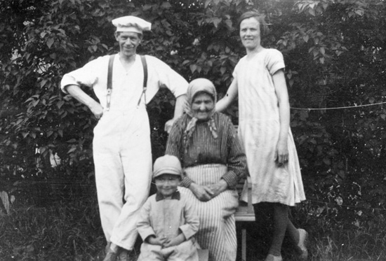 Bildtext: 75-årskalas på Edsgräfta (Esgräfta, Ersgräfta). Fv: Sara Enbom, Karin Enbom, Joel Enbom, Anna Gustavsson, Anton Nilsson, Kristina Holmqvist, Anna Hedberg, Frida Nilsson, Stig Olsson, Olle Olsson, Johan Edström, Anna o Olle Olsson, Vera Edström, Sally Uhlén, Märta Edström, Gerd Edström, Anna Olsson, Gerda Olsson, Olga Olsson