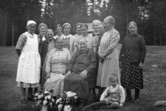 Bildtext: Borka. Födelsedagskalas (70 år) i Strand. Noterade namn: Nils-Erik Burman, Karin Enbom, Joel Enbom, Marta Burman, Valfrid Enbom, Margret Enbom, Anna-Lisa Svedin, August Sättlin, Kristina Engström, Olov Olsson, Anna Olsson, Johan-Olov Svedin, okänd, i korgstolen: Britta-Greta Holm, Greta Enbom, Gärda Sättlin, Anders Enbom, Ingeborg Holm, Lilly Sättlin, Algot Hagbom. Se även bild nr: xx-hbf-224
