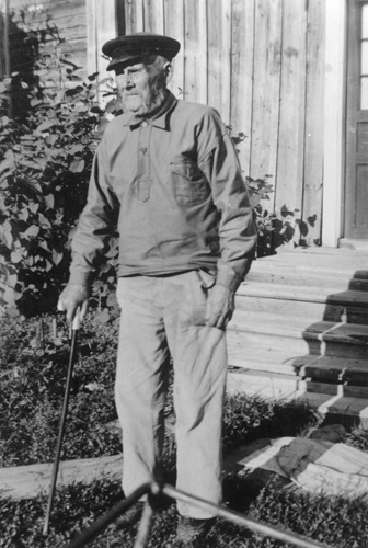 Bildtext: Borka. Födelsedagskalas (70 år) i Strand. Noterade namn: Nils-Erik Burman, Karin Enbom, Joel Enbom, Marta Burman, Valfrid Enbom, Margret Enbom, Anna-Lisa Svedin, August Sättlin, Kristina Engström, Olov Olsson, Anna Olsson, Johan-Olov Svedin, okänd, i korgstolen: Britta-Greta Holm, Greta Enbom, Gärda Sättlin, Anders Enbom, Ingeborg Holm, Lilly Sättlin, Algot Hagbom. Se även bild nr: xx-hbf-224