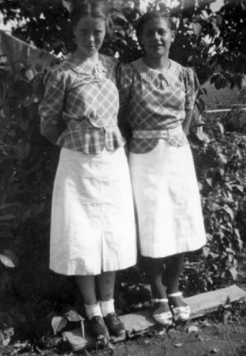 Bildtext: På bron i Wästnång, Finnika. Fv: Kaj Berglund, Lennart Sjödin, Sigrid Westling (i dörröppningen), Kerstin Westling (Larsson), Göta Sjödin och Sven Westlings döttrar Gunilla och Monica