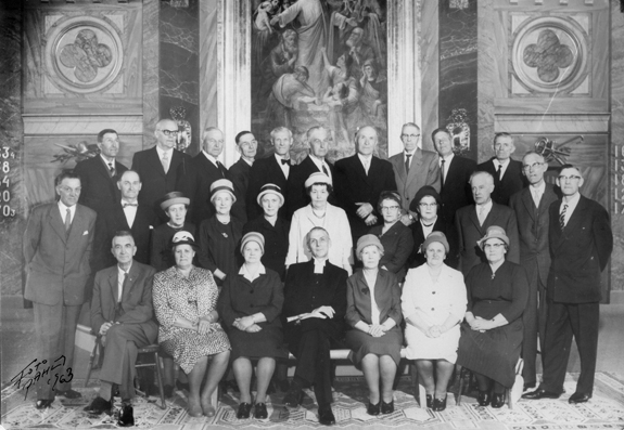Bildtext: Konfirmandjubileum, Enångers kyrka, 1913 års konfirmander, 50 årsjubileum. Noterade namn: Övre rad 6:e fv Karl Broberg. 2.a rad fv: John Eriksson, Eliot Burman, Kristina Svedin. 2:a rad fh: Melin, Arvid Enström. Främre rad tv: Anders Wedin, i mitten kyrkoherde Hans Persson. Komplettering: övre rad nr 1 fr vänster Sven Hedlund, mittenrad nr 5 fr vänster Hanna Nordin Asplund.