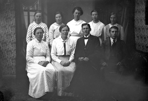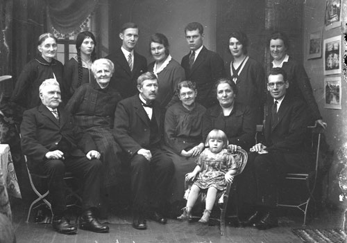 Bildtext: Olov Westlings 50-års dag. Från vänster: Karl Westling med fru Karin född Lindfors, Elin Westling gift Munter, Axel Westling med fru Karin född Hållén, Gunnar Westling, Hanna Westling gift Johansson, Märta Westling gift Brolin, Erik Westling, Hjalmar Westling, Olov Westling, Frida Westling född Svedin, Anny Westling gift Enberg, Gustav Westling,Einar Westling - son till Karl & Karin, Majvor Händel - dotter till Hanna, Allan Westling son till Axel & Karin
