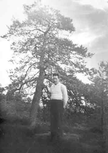 Bildtext: Vid Fjällmyra, Enånger. Elin Egnell, barnen Kerstin och Bruno Svenson, verkar vara en kolmila till höger.
