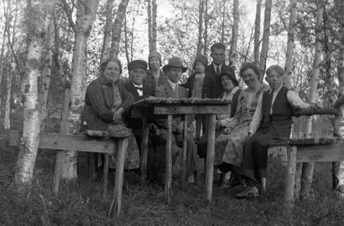 Bildtext: Gruppbild från Karskärs fiskeläge i samband med ekumenisk prästhelg (även kallat kyrksöndag). Initiativtagare var mannen i mitten, något till vänster med slips, läraren och riksdagsmannen Olle Westberg. Människorna på bild kom (i regel med båt) från såväl Enånger som från fiskelägen i området som t.ex. från Rävelsön, Bergön, Våtnäs, Vitön, Sörön, Gillingsön m.m. Inkommen bildsynpunkt: Olle var under en tid bosatt i Finnika men flyttade sen till Ljusdal.Där kom han också att arbeta som rektor.