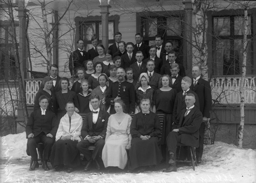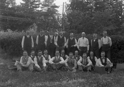 Bildtext: Ledamöter i Enångers kommunalfullmäktige samlade inför årets första möte 1919. Bakre raden f.v: Karl Broberg, Finnika, Algot Johansson, Bro, Olle Lindfors, Borka, Jonas Bergman, Bölan, Leon Östberg, Oppänge, Ernst Eriksson, Brofors, Otto Hendriksson, Bölan, Karl Sundström, Tosätter, Otto Nilsson, Oppänge, Ivar Hultman, Grängsjö. Främre raden från vänster: Per Settlin, Tosätter, Erik Gustavsson, Hålsänge, AW Ståby, Hökberg, LJ Enkvist, Haga, Jonas Andersson, Änga, Adolf Wallström, Fläcka, Anders Andersson, Hökberg, Henrik Winlöv, Bölan, Andreas Åker, Vedmora, Sven Gerdin, Svedja, PA Persson, Ådalen, Svante Svensson, Sätra, OW Enbom, Haga. Bilden fanns publicerad i Hudiksvallstidningen den 30/10 1990, varifrån namnuppgifterna är hämtade. Platsen är gården kallad Björkliden, senare Holms. Byggnaden torde ha inrymt café vid denna tid.