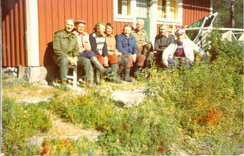 Bildtext: Anna, Arvid och Carin Thorén (f 1922), samt Carins kamrat Greta Olsson, Rosendal framför deras hus vis Södertjärn (Sörtjärn) Byatillhörigheten lär vara Hökberg. (Greta blev gift med Gustav Paulsson från Hökberg)
