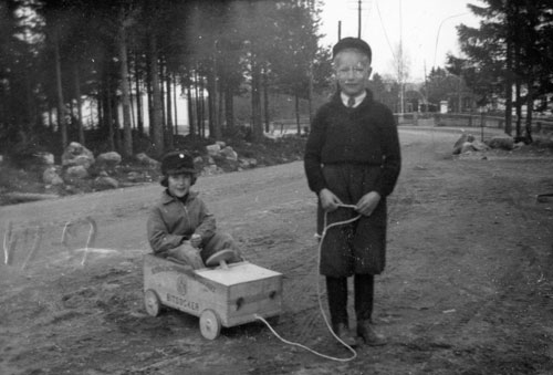 Bildtext: Sannolikt är bilden tagen vid det tillfälle då en fastighet längre upp efter Brovägen vid namn Kyrkmyra brann 1938.