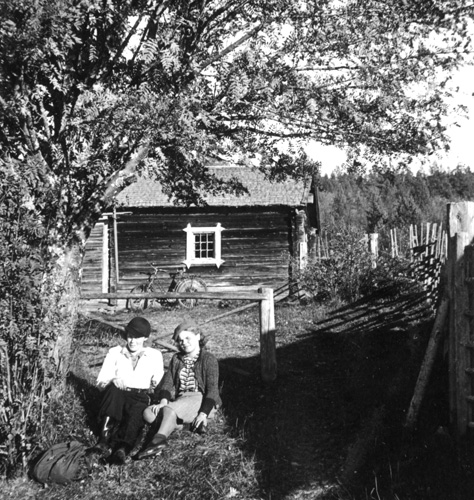 Bildtext: Kvinnor och män samlade vid tröskning hos Rehnströms i Vedmora. Personerna är fr.vä. Kristina Frisk, Albin Sjödin, Eivor Rehnström, Kristina Lindblom, Axel Rehnström, Ev. Einar Norin, Ida Rehnström, Martin Newberg och Evert Lindblom.