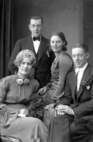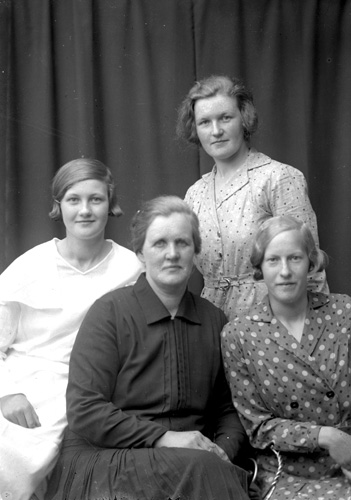 Bildtext: Fjälebor. Fr.V Bertil Eriksson, Karl & Karin Åkerlund, Per Jonsson, (skymd Gunnar Eriksson), Erik Eriksson, Johan Åkerlund, Per Eriksson, Alma Fernlund, Signe Östlin, Tilda Jonsson, Jenny Lindfors från Borka, Anna Eriksson, Sonja Åkerlund, Linnea Åkerlund från Finnika, Ann Mari Eriksson, Axel Eriksson, Sture Åkerlund från Finnika, Alve Eriksson, Jenny Eriksson, Per Olov Eriksson, Per Åke Eriksson, Bror Eriksson, Stig Eriksson.