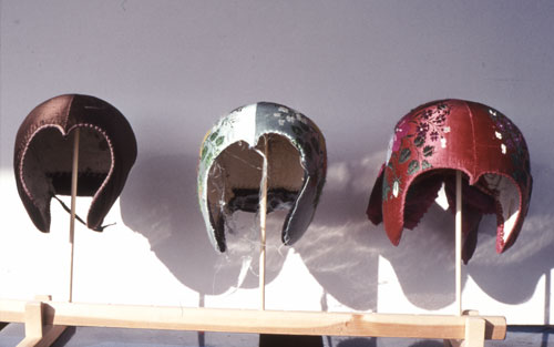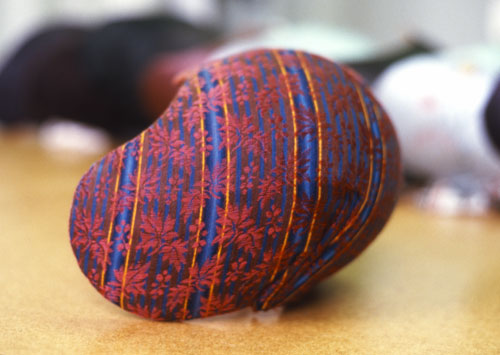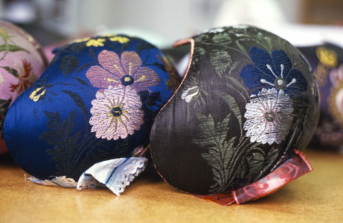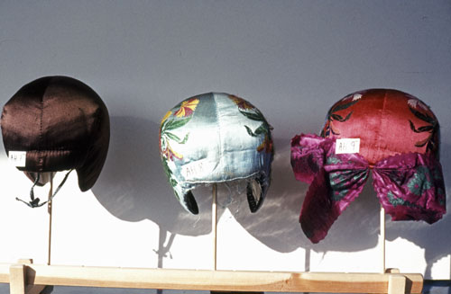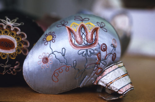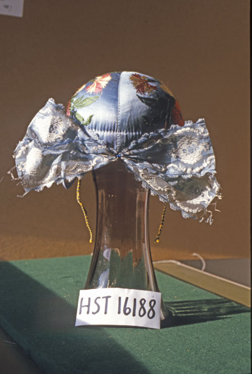 Bildtext: Bindmössa. Halvsiden, brokad. HM.
