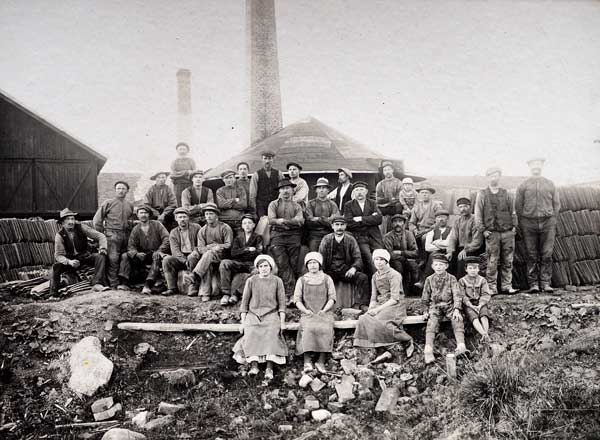 Bildtext: Frans Oskar Israelsson, hans döttrar och frun Brita, född Brolin i Lingarö. Dottern Greta, stående med flätorna var född 1905 så bilden borde vara från 1912-1913. Bakom dem är tegelbruket, sidan som vätter mot lertaget. Bakom grandungen på bilden är en utbyggnad, själva ugnen med största skorstenen. Den andra skorstenen hör till ångmaskinen.
