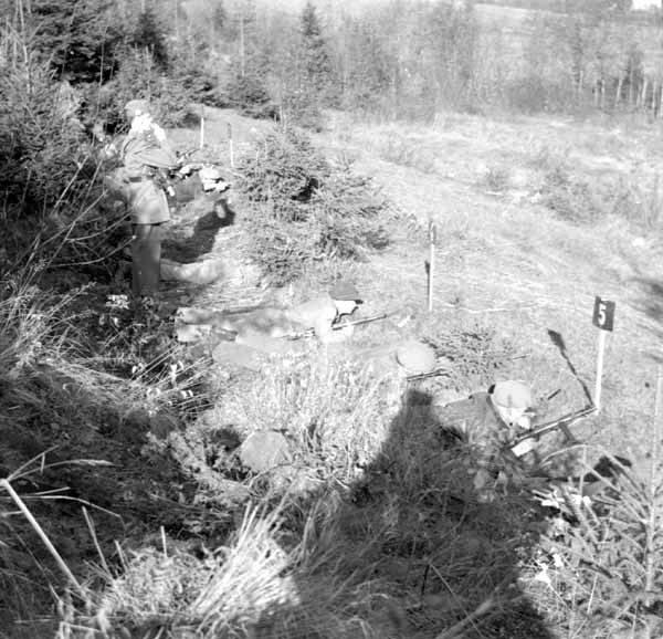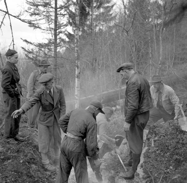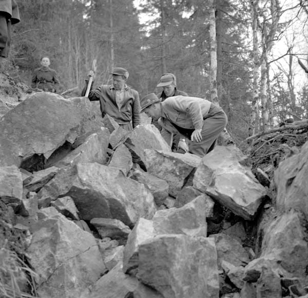 Bildtext: Rivning av gamla Handelsbolagets byggnad i byn Lund (Sörforsa). Ny byggnad uppförd vid fyrvägskorsningen. Nu benämnd ICA Forsa, före detta Forsahallen. I bakgrunden Udéns fastighet, innehållande bl a butik.