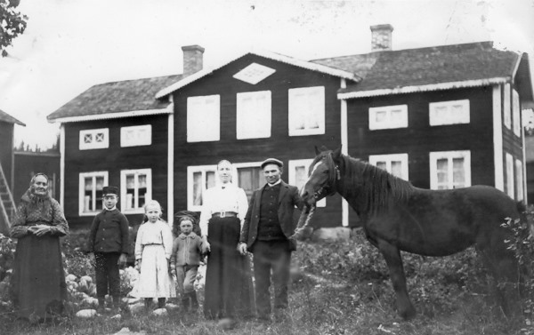 1980, Edvin Larsson 1906-1940, Brita Helena Persson f.Hellzen f.27/5 1876 +31/8 1942 och Lars Persson f.25/1 1874 +12/6 1964. De två sistnämnda gifte sig 18/5 1900. Fotot taget utanför gården Daniels i Långby ungefär 1910
