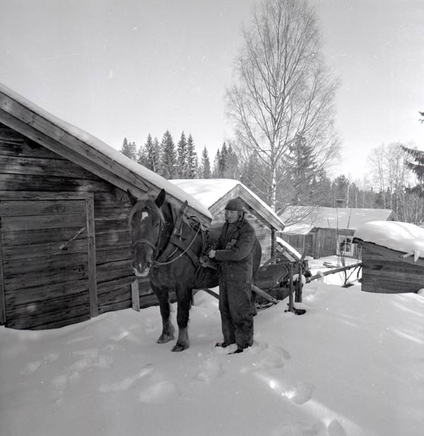 Sökord: fäbod, vinter Motivkategori:hästar och folk Id:15273 Fotograf: PH Lindh Fotoår: Troligen 1960 Bildnummer: PH053-105 Förening: Forsa Sockens Hembygdsförening Land: SE Motivplats: Teknik: Inskannat negativ 6 x 6 cm s/v Rättighet: Forsa Sockens Hembygdsförening Originalplats: (visas ej publikt)