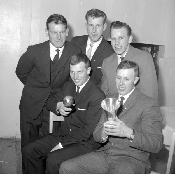 Bildtext: Yngve Abrahamsson, Göran Abrahamsson och Lennart Abrahamsson, bröder från Edsta i Hög. Sittande: Bosse Larsson, och Henry Larsson (körde bryggarbil åt Bockens) från Edsta Hög.