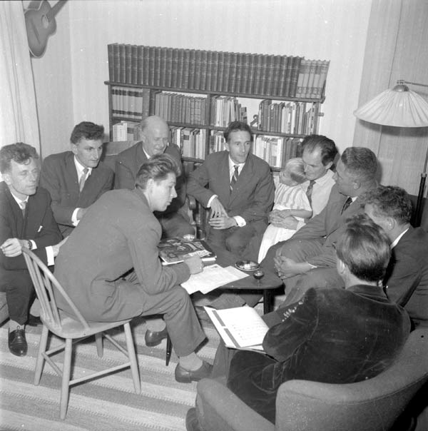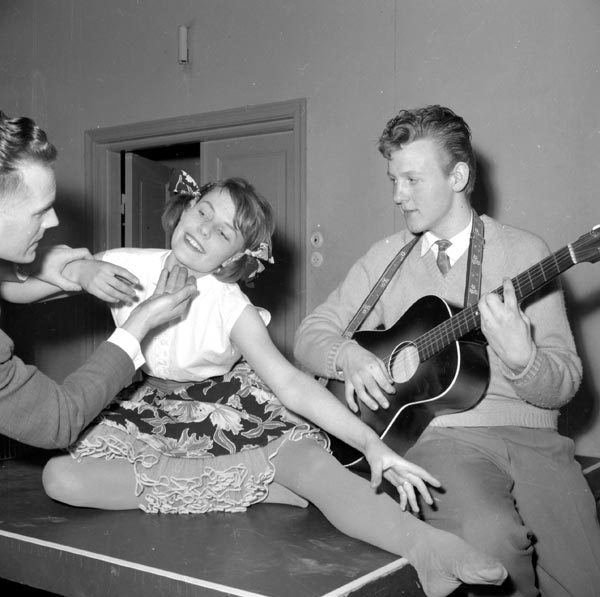 Bildtext: Kabaré på ungdomsgården i Sörforsa. Från vänster: Erik Hiller, okänd, Bert Johansson