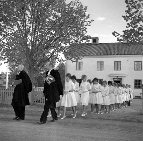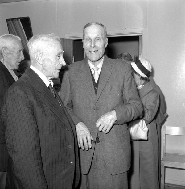 Bildtext: Konfirmationsjubileum vid Forsa kyrka. 1897 års konfirmander vid 65-årsjubileum 1962. Från vänster: Helen Persson från Vålsta/Nansta, Anna Mickelsson Berglock, Erik Prim Häggnäs , Brita Olsson från Nygårn i Tövsätter, Olov Klang, Lund, Katrina Olsson Andersgården Långby och Karl Jonsson Näsviken.