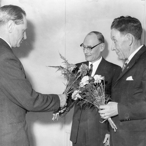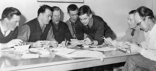 Bildtext: Från vänster: Helge Sverin, Sture Rahm, Birger Eriksson, Anders Byström, Gunnar Viktorsson, Erik Samuelsson och Anton Westin.