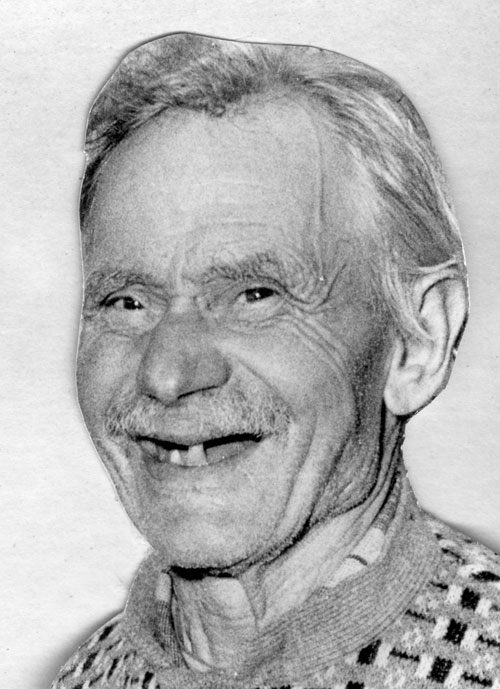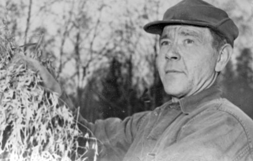 Bildtext: Jonas Alm, Långby hugger ved. Aina Marie Thor skriver att detta är min far. Han blev 93 år gammal. Var alltid mycket pigg och aldrig sjuk. Arbetade i skogen tills han var över 80 år. Älskade folkmusik på fiol, även dragspel. Var själv duktig på att spela munspel. I sin ungdom gick han runt på vallar och spelade upp till dans, hade då tvåradigt durspel. Han var bra på att berätta historier från förr. Och hade ett otroligt minne. Tillhörde även Saronförsamlingen i Forsadalen. Han var en av de sista indelta soldaterna. Varje jämn födelsedag på ålderns höst kom det alltid kaptener och majorer från regementen från Gävle för att gratulera honom.