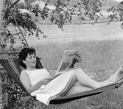 Bildtext: Britta Reinholdsson ligger i hängmattan och läser Hudiksvalls-Tidningen