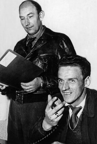 Bildtext: Okänd man och okänd pojke tittar på får i fålla. Fårförsäljning?