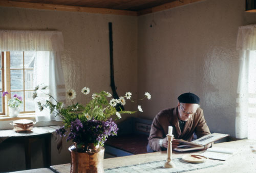 Bildtext: Interiör från okänd gård: okänd man tittar i fotoalbum(?). På bordet en kopparkittel, på väggen bakom ett gevär.