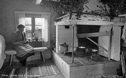 Sökord: kvinna, rum, stuga, öppenspis, interiör, inomhusmiljö