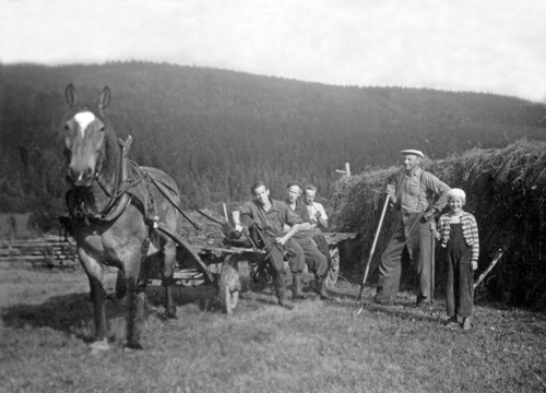 Bildtext: Karin Söderlund med barnen Gustav, August, Karl, Hilding, Anna och Siri Söderlund år 1913 eller 1914