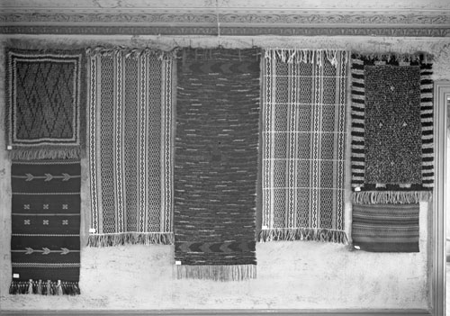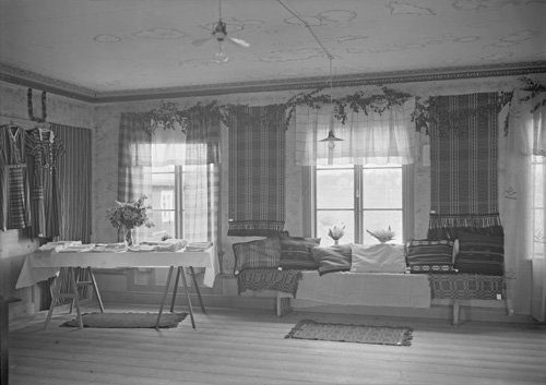 Bildtext: S.L.U., Bygdegården, Klångsta, Forsa. Grupp av kursdeltagare med fru Rodenstam, Hudiksvall. Näst längst till höger kan vara Emma Nyman Lumnäs, Forsa f.1904 d.1958. G.Jonsson i Fårsvea, Forsa. Katarina Wilhelmsson säger att fjärde från vänster är Olga Johansson, Ransta.
